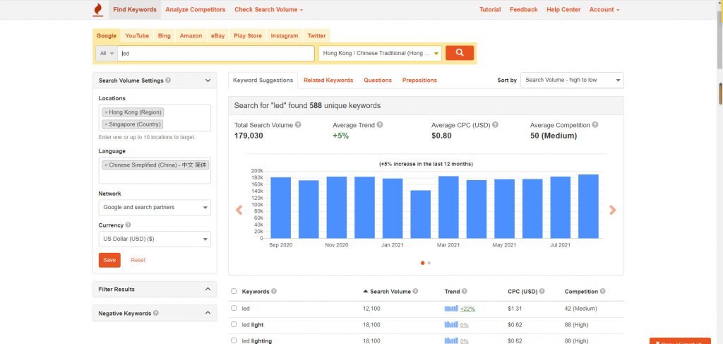 Keywordtool.io主要也是给我们提供谷歌 Google的搜索提示词,它能生成长尾关键字思想。可以看多平台的搜索量。