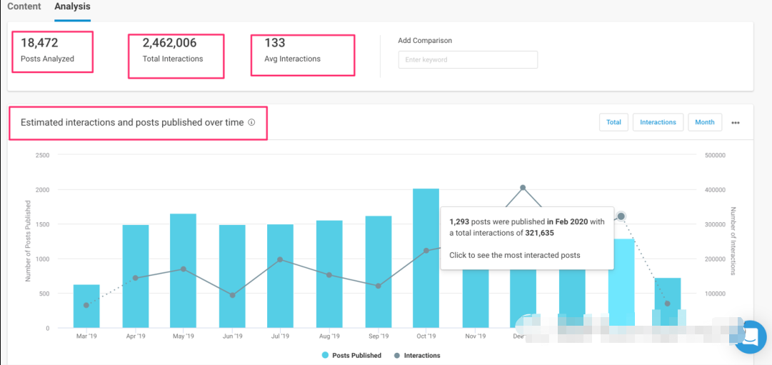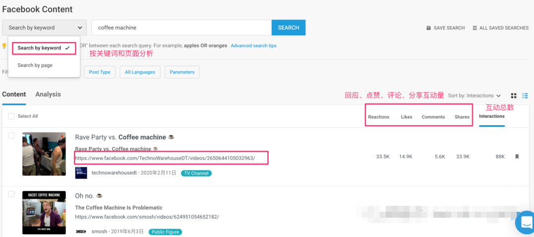 在右侧分析标签,显示该关键词相关的Facebook内容的数量、互动总量、平均互动量、随时间的内容发布数和互动数量等。反应了该关键词在Facebook上的热门程度。