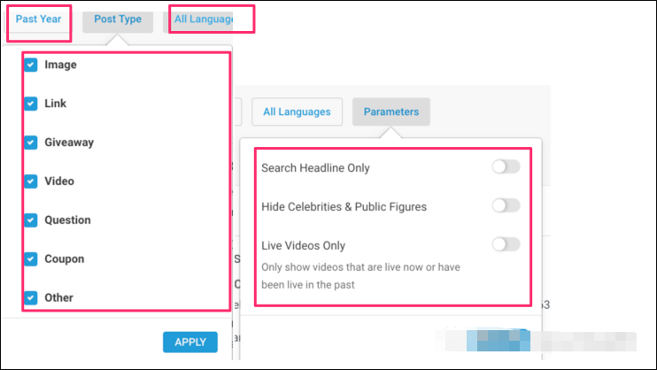同样,搜索时可以按照发布时间、内容类型、语言等进行筛选。