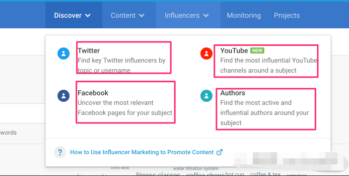 Buzzsumo的使用非常简单,最主要的有这么几个功能:Discover板块的实时热点和内容趋势、Content板块的内容搜索、Influencers板块的寻找红人。