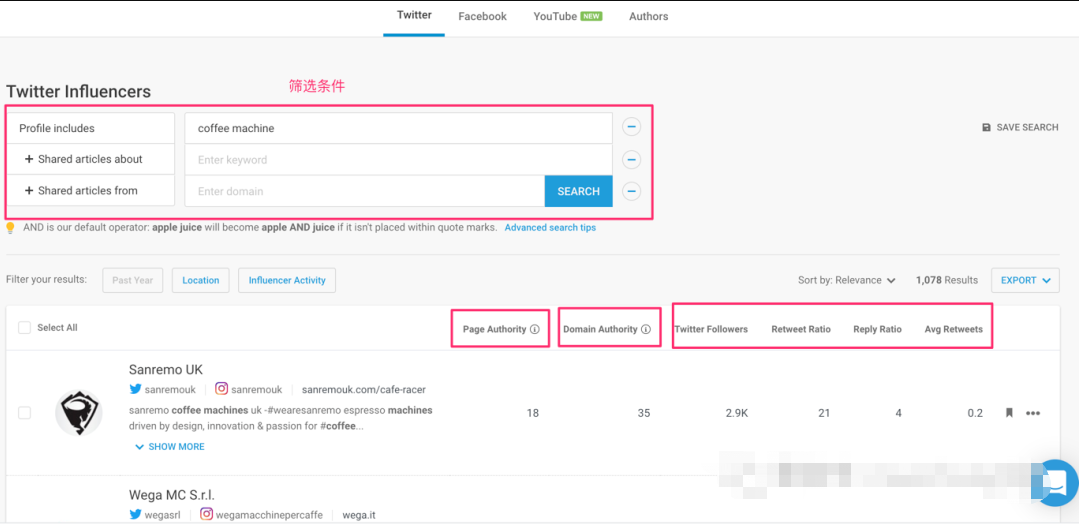 根据涉及主题、分享相关关键词文章、或分享了哪些文章等筛选条件,搜索出相关twitter红人。
