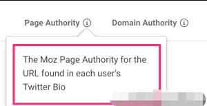 其中Page Authority表示:在该Twitter用户的Bio中找到URL的Moz页面权重。