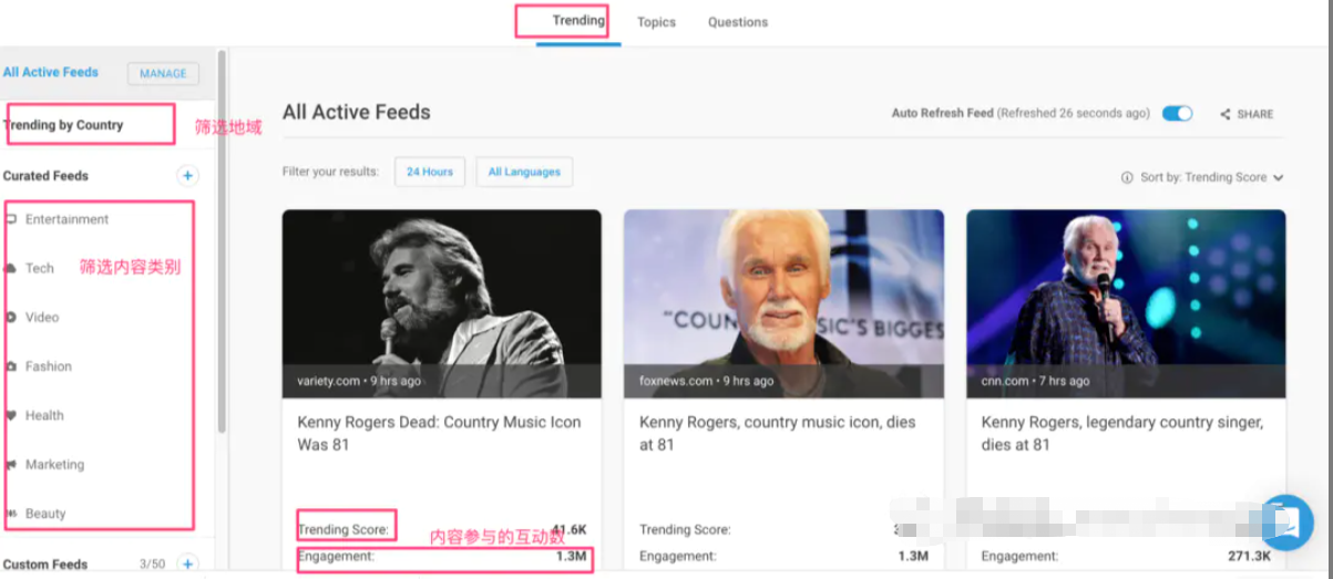 如下图所示,热门内容趋势,可以按照地域、内容类别进行筛选。内容板块显示内容的参与互动数量。