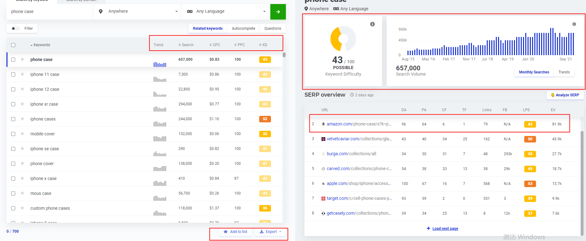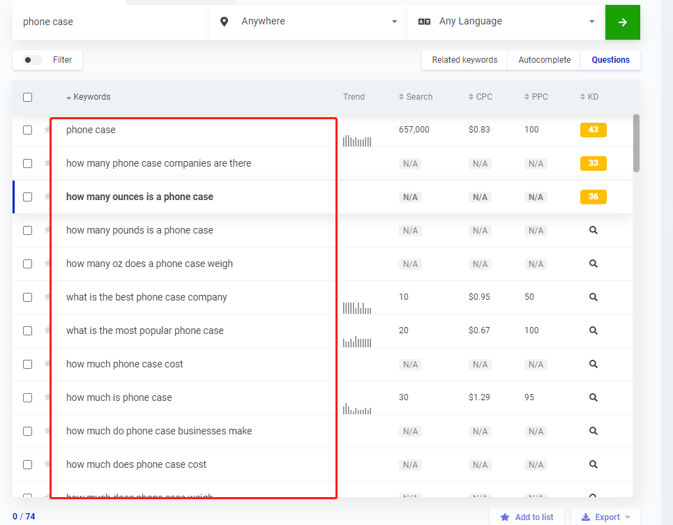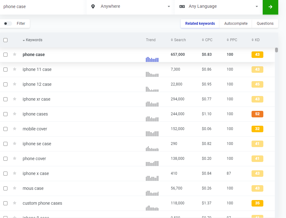 如下图,这是搜索词phone case 的Kwfinder Suggestions